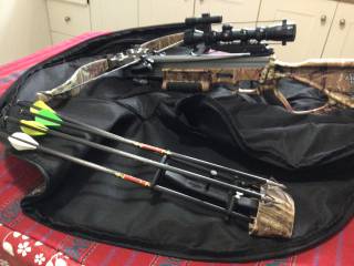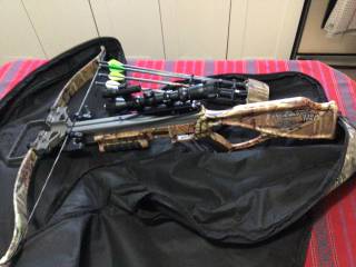 Avec télescope 4 x 32 à 5 position avec Laser . Vendu avec 4 flèches de chasse avec les pointes de chasse et de pratiques ainsi qu'un etui de transport.