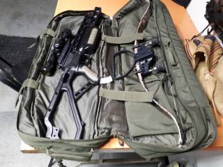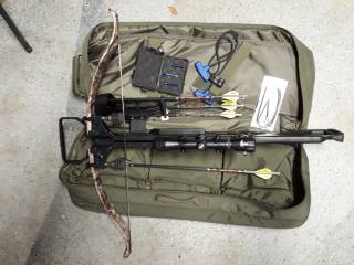 usage comme neuf .tire seulement 10 flèches de pratique .Viens avec 4 flèches et 3 pointes de chasse neuveet corde de rechange.Etui compac pratique pour le transport et le remisage